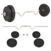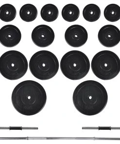 This set of ergonomically designed barbell/dumbbell set will allow you to perform a large range of exercises more easily and safely at home or in the gym. The set includes 1 barbell, 2 dumbbells, and 16 weight discs. The barbell/dumbbell set features solid chrome-plated bars with quick-action spring collars (barbell bar), non-slip grips, and fluted star-screw caps (dumb bell bar) for secure attachment of the weight discs. You can work out without worrying about safety issues. The weight discs are made with a robust PE casing. They can be combined in various ways for different training purposes. Delivery includes 1x barbell bar, 2x dumbbell bars, 6x 1.25 kg weight discs, 4x 2.5 kg weight discs, 4x 5 kg weight discs, 2x 10 kg weight discs, and 6x caps.