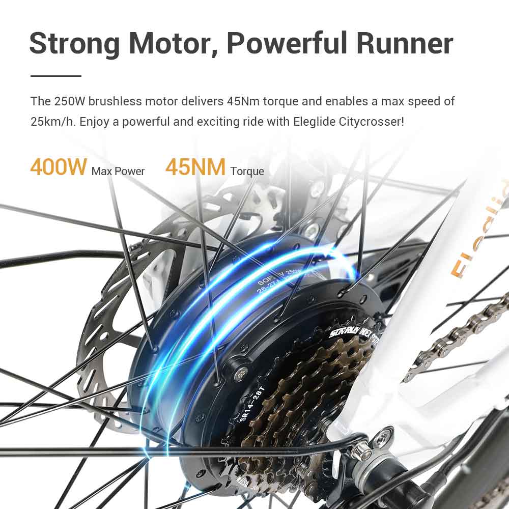 Eleglide Citycrosser features dual brake discs and an auto power-off function, enabling the bike to brake quickly and smoothly.
