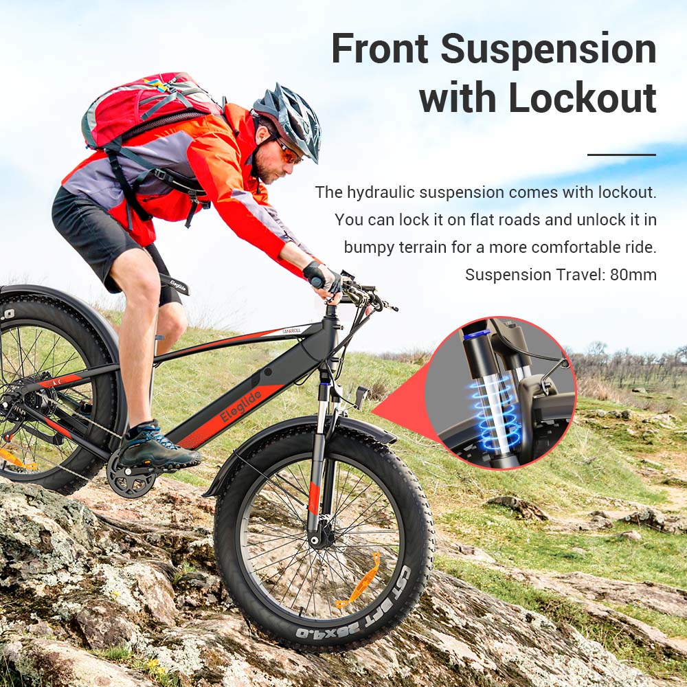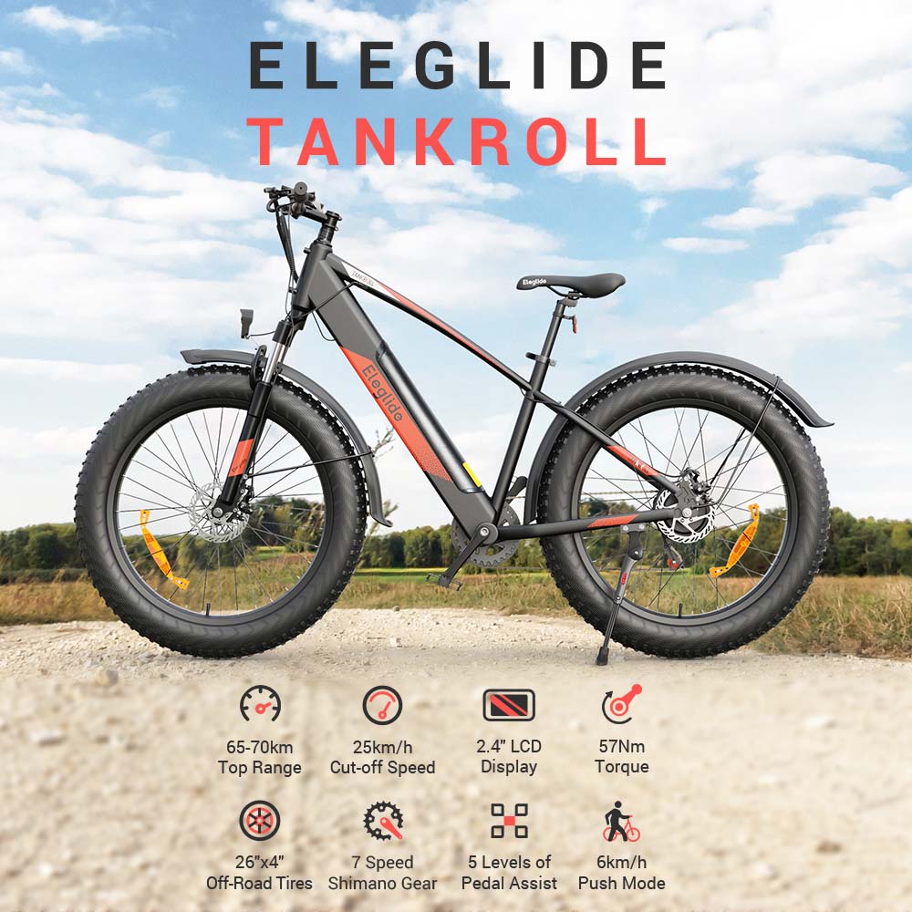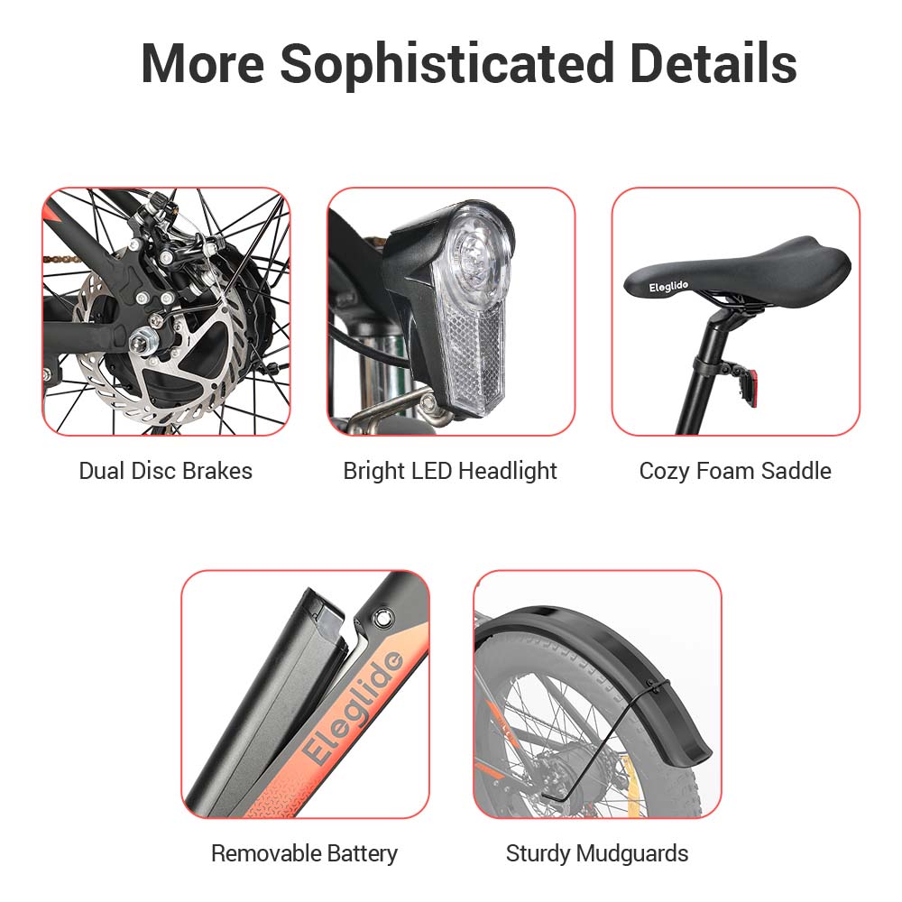 Eleglide Tankroll features dual brake discs and an auto power-off function, enabling the bike to brake quickly and smoothly. The upgraded suspension comes with a lockout that allows you to lock it on flat roads for a fast ride and unlock it in bumpy terrain for a comfortable ride.