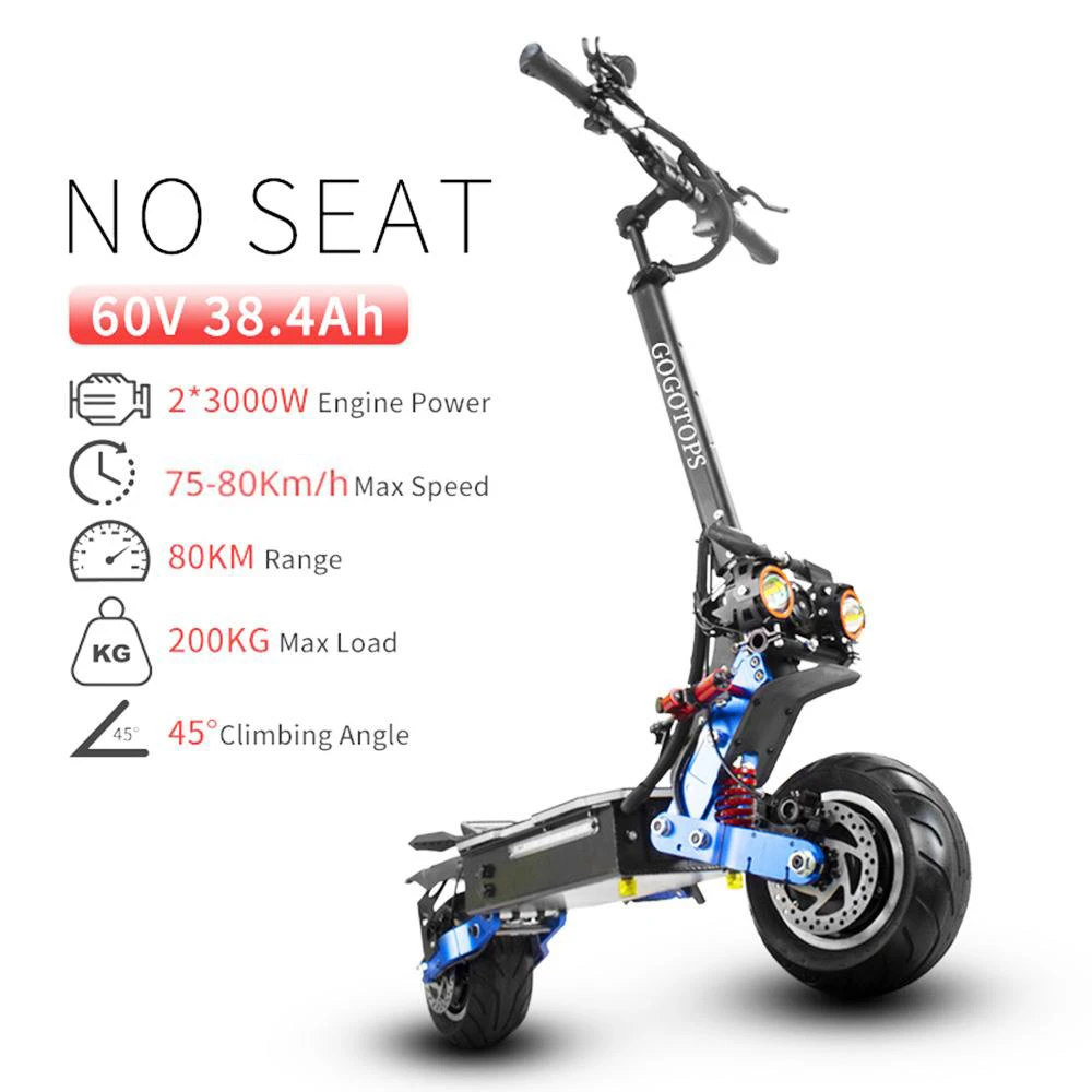 GS8 3000W*2 is with unique blue color of gogotops, it is a dreamed color of big boys. 60V 6000W with fat wide tires , speed up to 80km/h, mileage up to 80km, with a battery capacity 38.4Ah.
