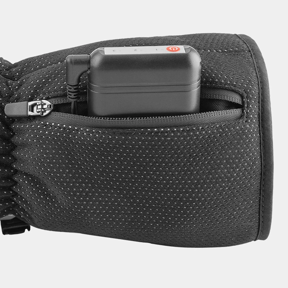 Battery powered Composite fiber heating wire element, optimally placed in the hand for quick warm-up and even distribution of heat across the hand and fingers.