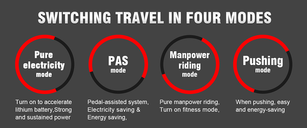 There are pedaling mode(or the riding mode), moped mode and electric mode for you to choose from for either an effortless riding or a fitness scheme.