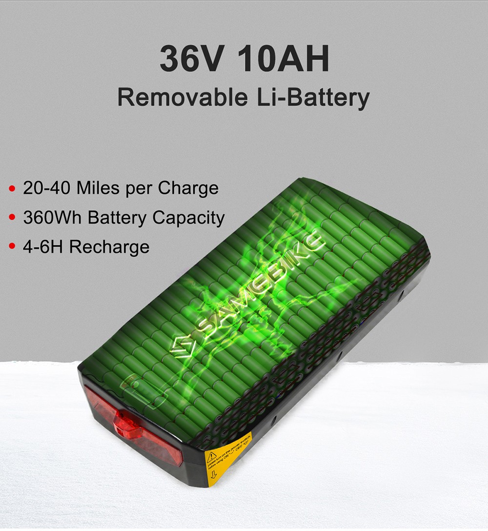 32km/h max speed and climbs a 25 degree slope thanks to the power provided by the 350W motor . The 10Ah 36V Li-ion battery can support 20-40miles on a single charge when riding in electric mode and 40-80km max range when riding in moped mode.