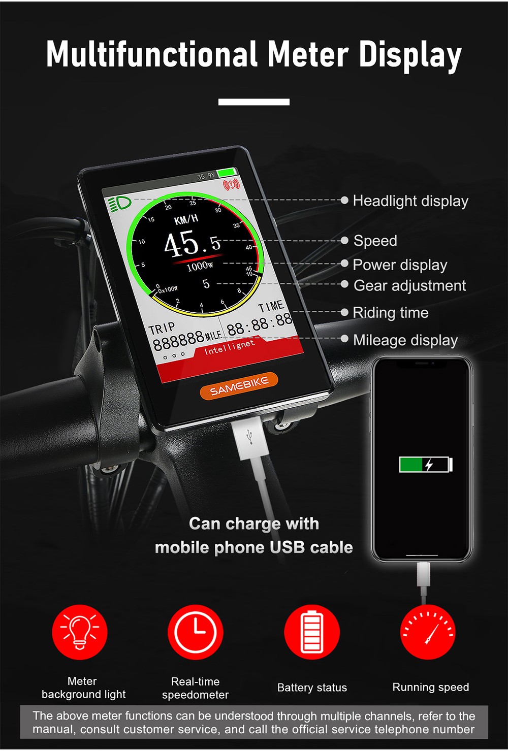 The bright headlight can make you ride at night more safely.